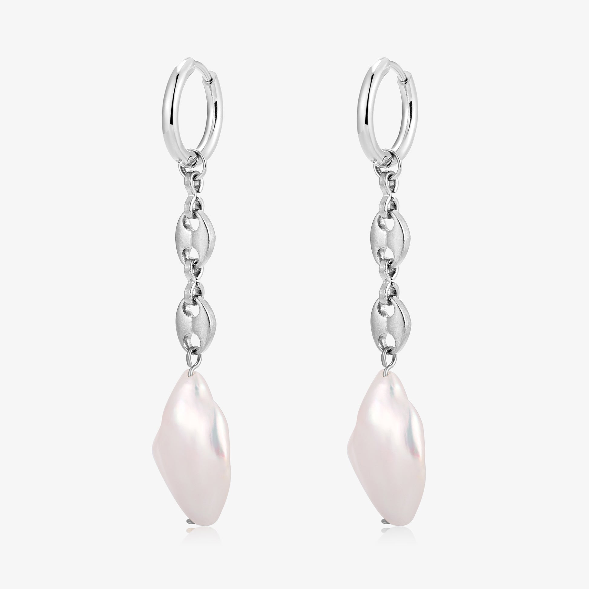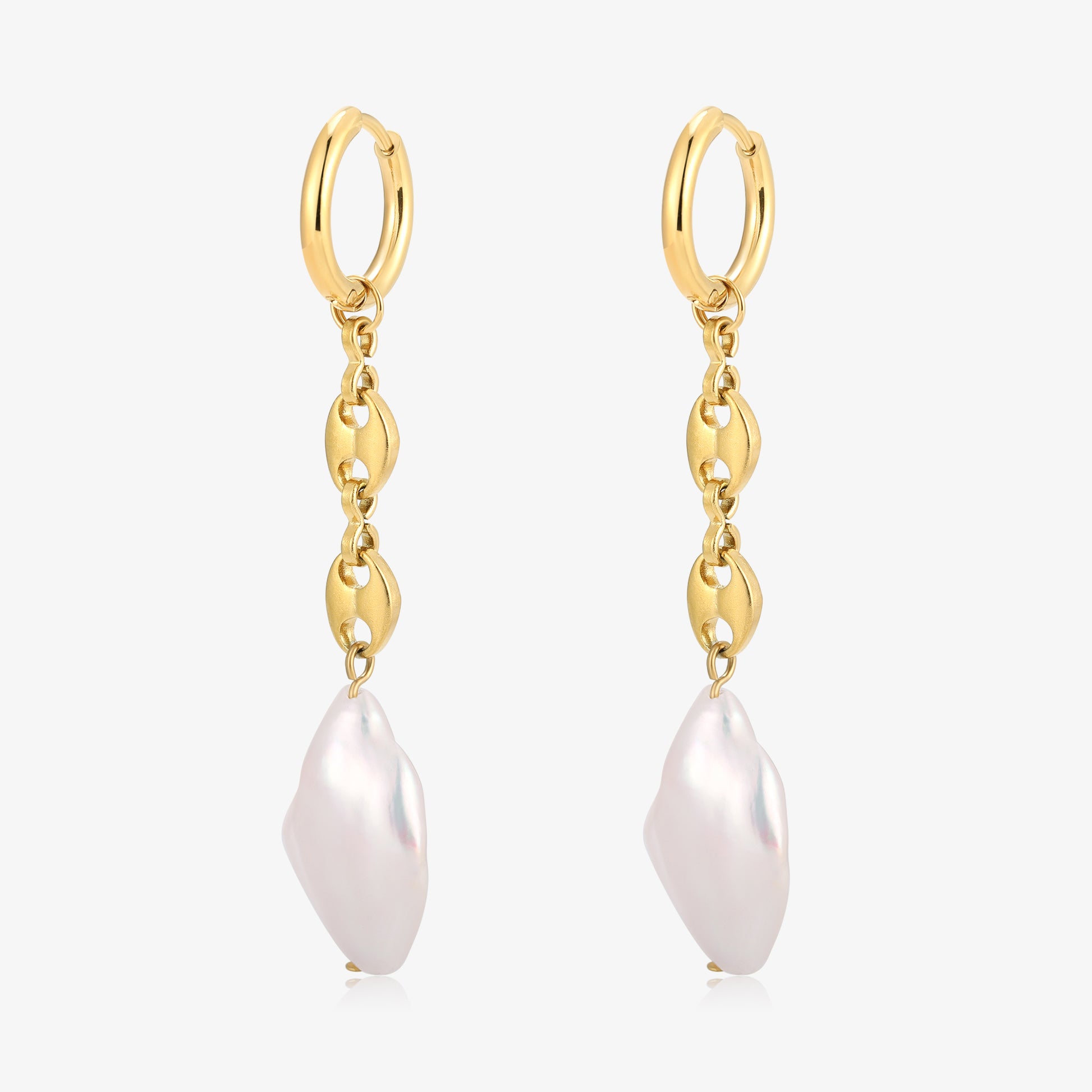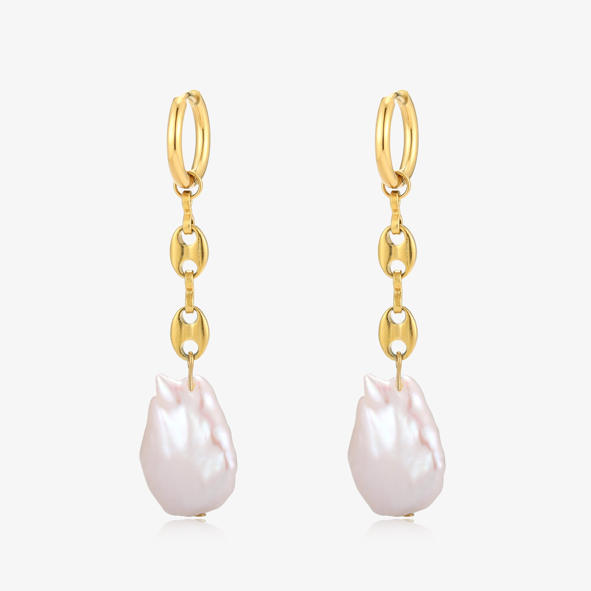 A radiant fusion of modern polish and natural charm, these statement earrings feature luminous, one-of-a-kind baroque pearls suspended from a sleek chain of matte gold links. Each pearl is hand-selected for its organic shape—no two are alike—ensuring your piece is as individual as you are.