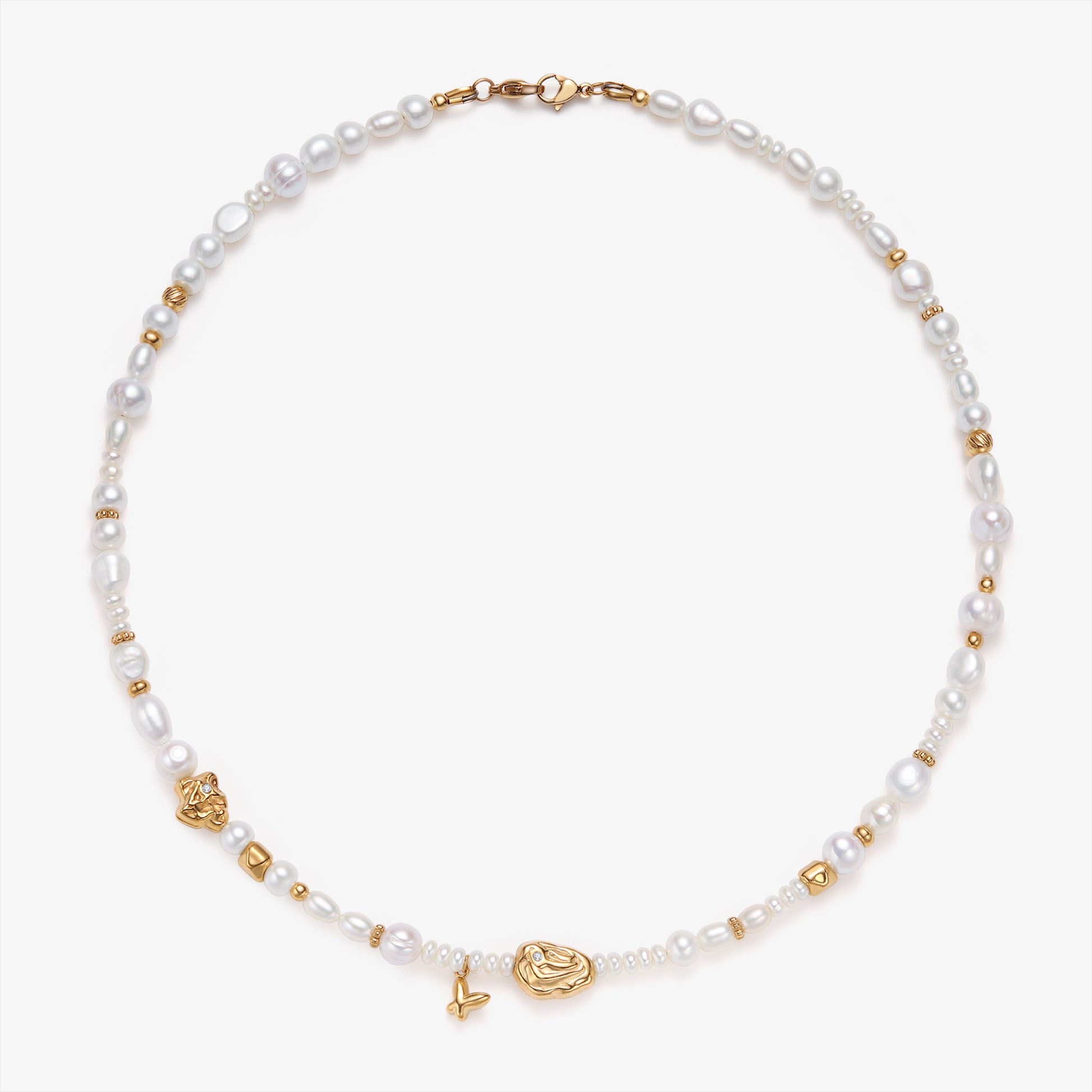 Each pearl—imperfect, radiant, and utterly unique—is a chapter in a story of elegance. Gently curved, organically shaped, and strung along a golden thread, these freshwater pearls reflect light and life from every angle.