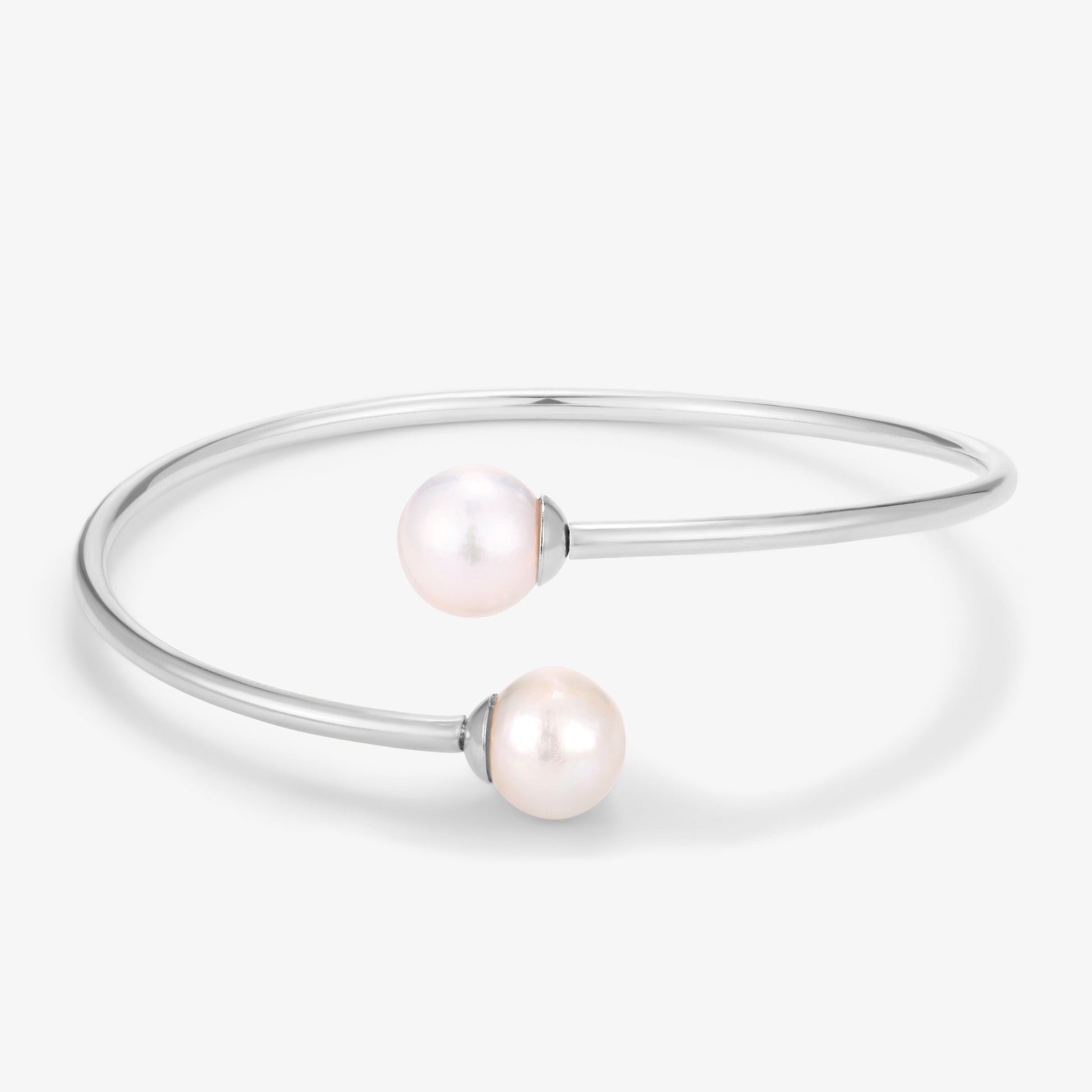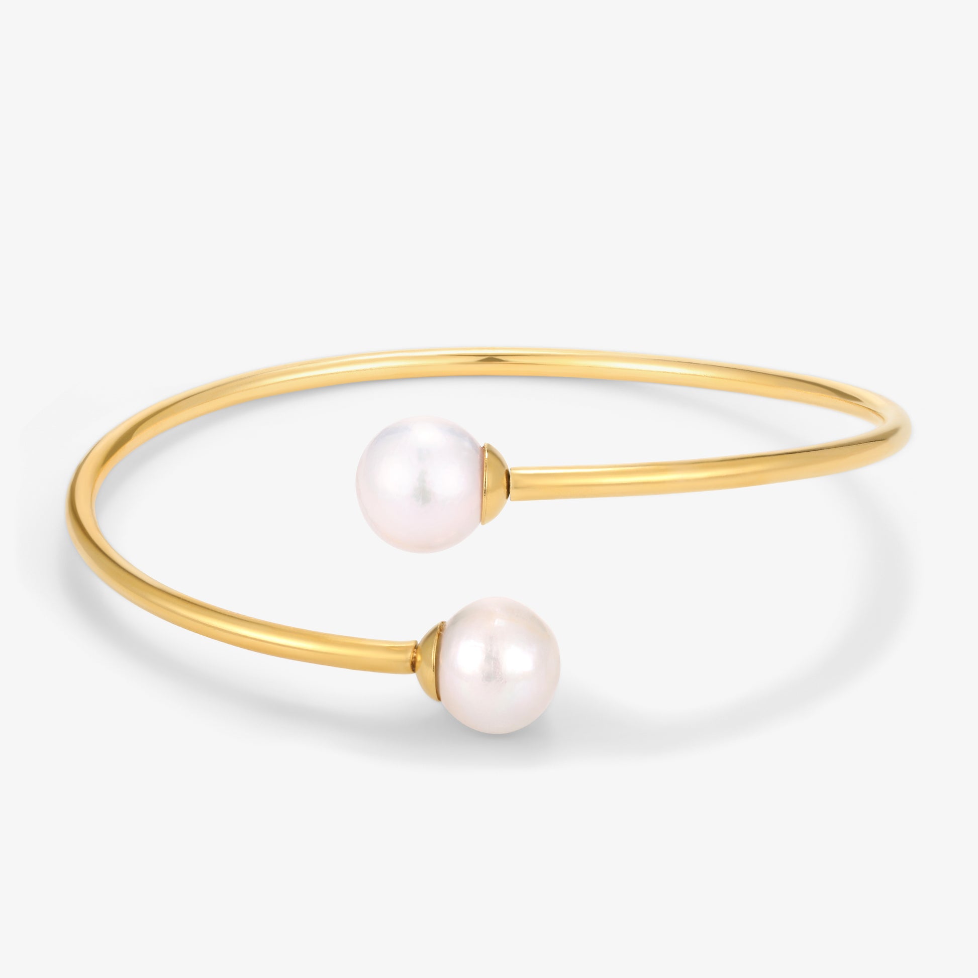 This elegant open cuff bracelet features a sleek gold/silver band with two lustrous pearl accents. Each pearl—imperfect, radiant, and utterly unique—is a chapter in a story of elegance. Perfect for adding a touch of sophistication to any outfit.