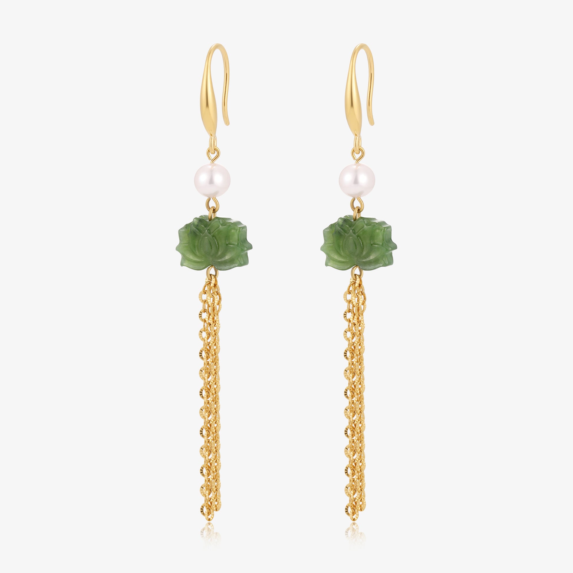 Long Dangle Flower Jade & Fresh Water Pearl Earrings