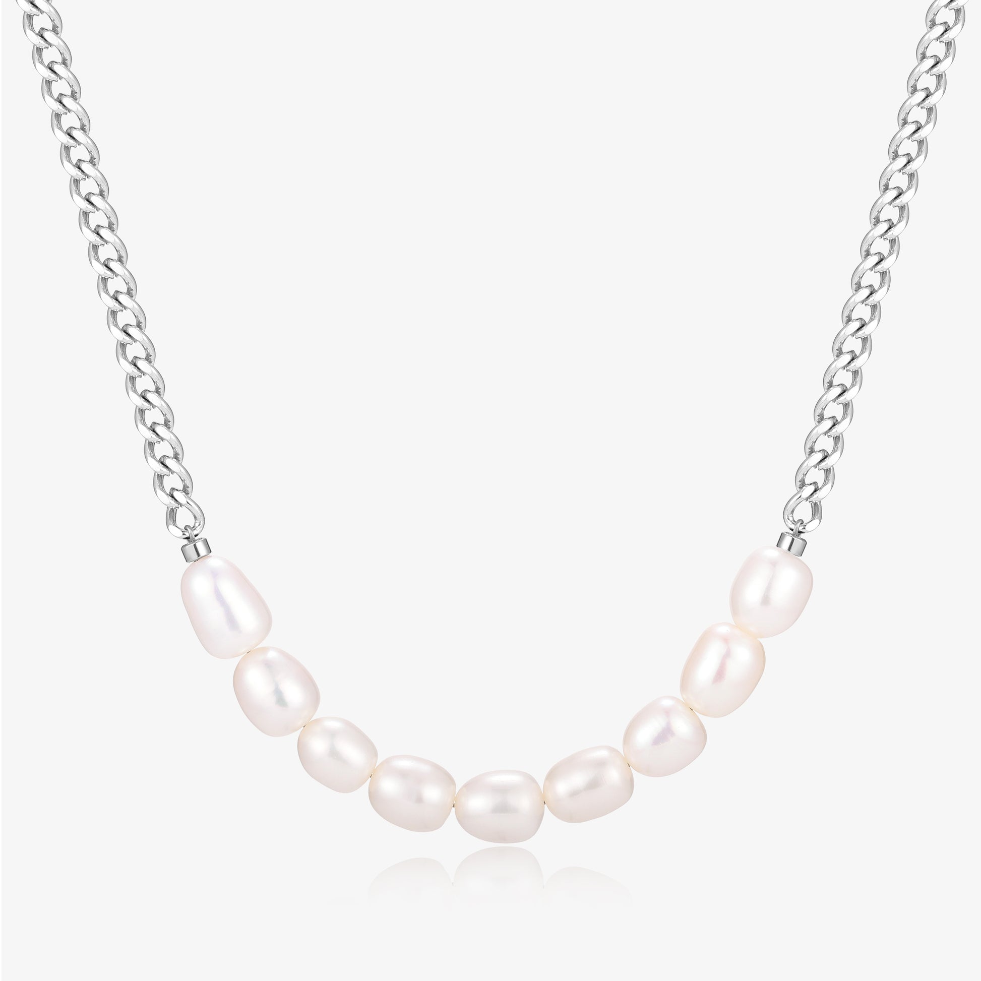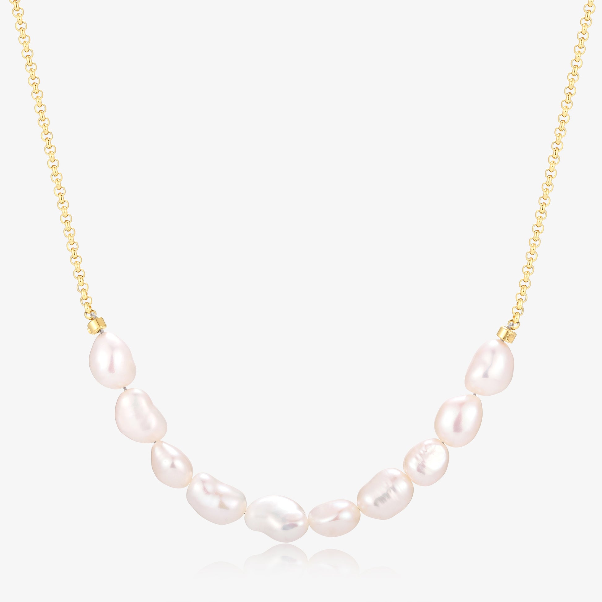 Each pearl—imperfect, radiant, and utterly unique—is a chapter in a story of elegance. Gently curved, organically shaped, and strung along a golden thread, these freshwater pearls reflect light and life from every angle.