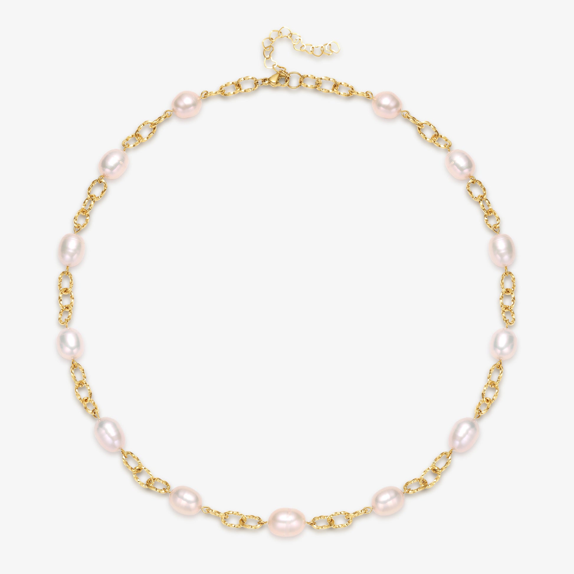 Each pearl—imperfect, radiant, and utterly unique—is a chapter in a story of elegance. Gently curved, organically shaped, and strung along a golden thread, these freshwater pearls reflect light and life from every angle.